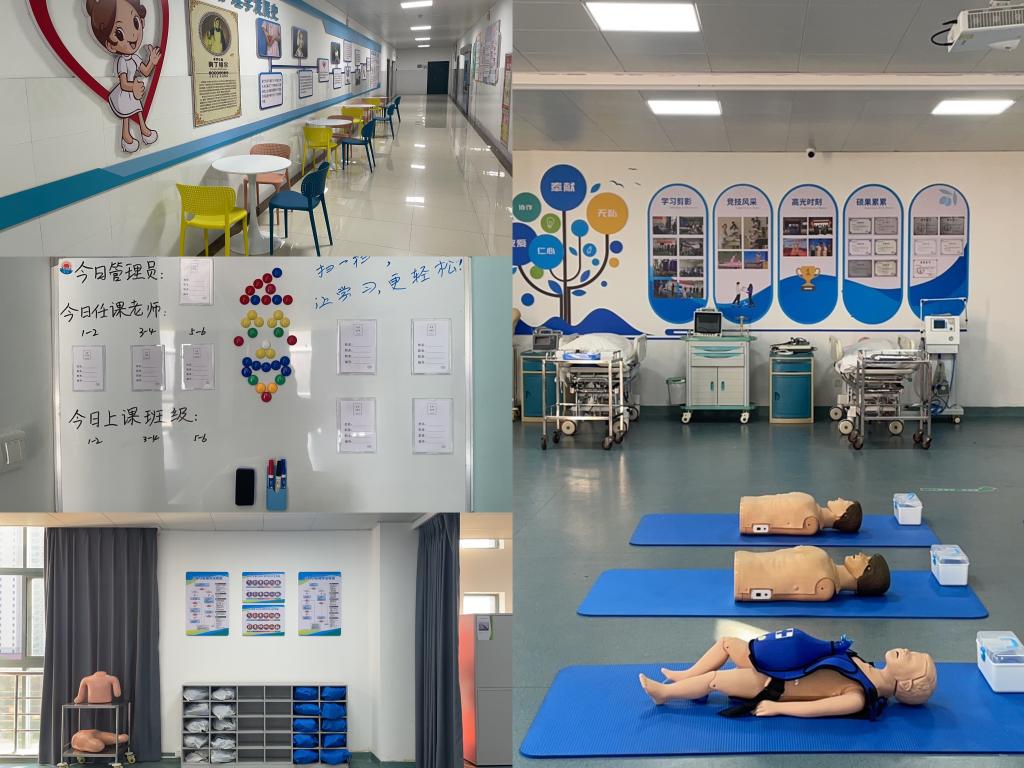 现场急救室能够满足院前急救、灾难救护及院内急诊科救护三种救护场景的教学需求,是省内一流的急救护理实训基地。实训室内配备了各种CPR模拟人、除颤仪、各种包扎模型、场景式急救系统、场景融合系统、配备气道异物冲击清除套装、现场综合急救包等各种急救训练设备,通过模拟真实临床环境,将知识、技能、态度融合,突破传统的“文化课—专业基础课—专业课—技能训练”的教学模式框架,采用理论结合实际,以项目为载体,以实训为手段,融“教、学、做”为一体的“理实一体化”教学模式,帮助学生更好地适应临床工作,提高处理复杂实际问题的能力并提高职业素养,为日后走上工作岗位打下坚实的基础。
