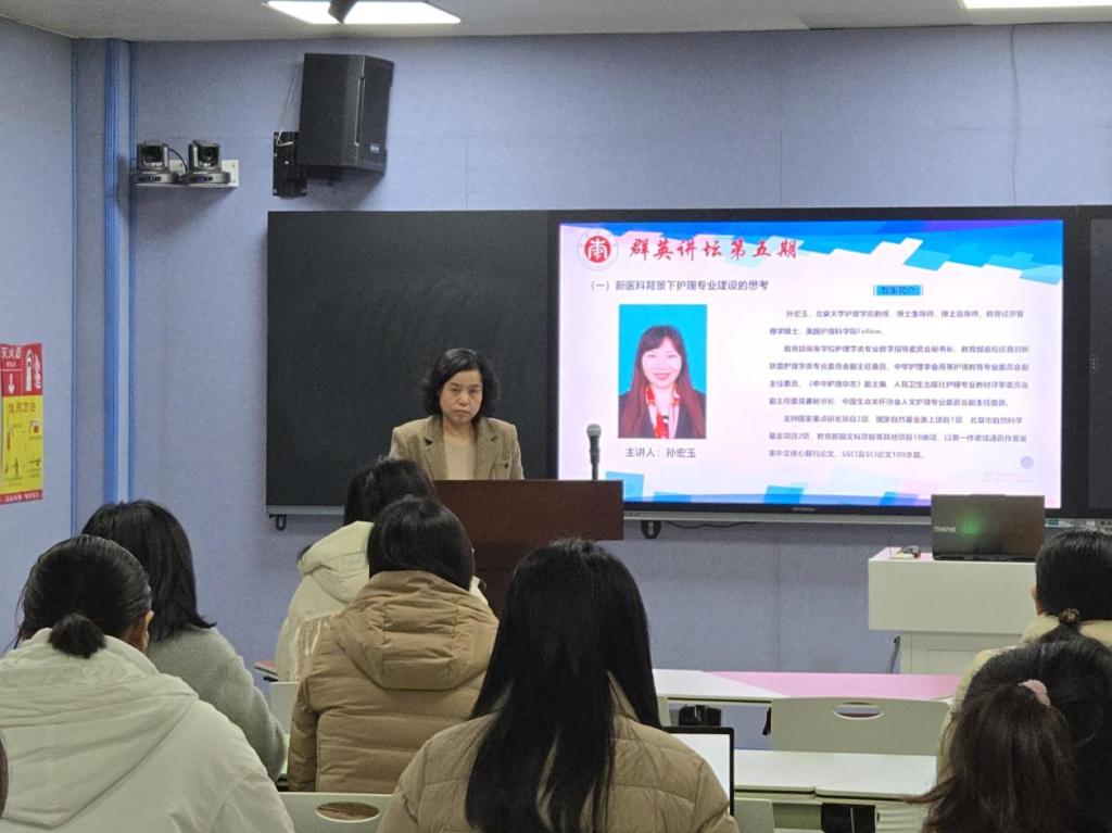 首先,由北京大学v站体育官网孙宏玉教授,以《新医科背景下护理专业建设的思考》为题作学术报告,孙教授为我院教师深入解读了新时代本科教育的精神内核与核心理念,并紧密关联护理专业的发展趋势,详细剖析了在“新医科”这一宏观背景下,如何系统性地推进专业建设及课程体系的革新。报告内容充实,具有高度的指导价值,为我院在新医科建设领域的后续工作提供了明确的方向指引。