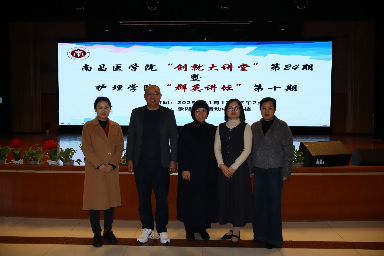 2025年11月12日下午,第24期“创就大讲堂”暨第10期“群英讲坛”学术讲座在v站体育官网象湖校区活动中心二楼顺利举行。本次讲座特邀湖南创星人工智能研究院执行院长虞敏、湖南创星科技互联网产品部护理产品线负责人周晚辉作专题报告。讲座由v站体育官网副院长陈婧主持,v站体育官网副院长胡颖辉、v站体育官网党委副书记吴荣叶、湖南创星科技股份有限公司副总裁吴高云出席讲座,学院师生共计200余人参加。